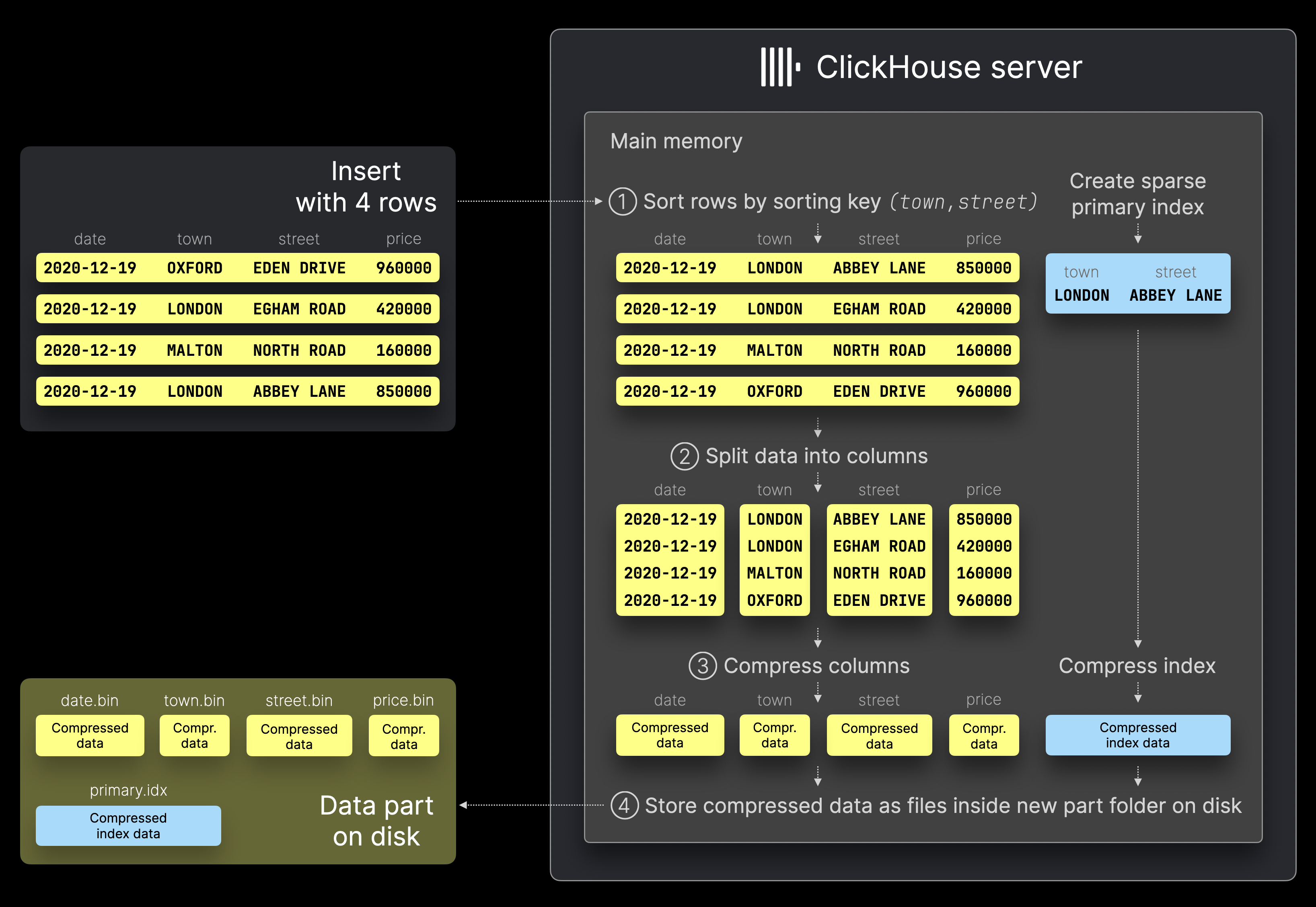 Сортировка: Строки сортируются по ^^ключу сортировки^^ таблицы (town, street), а для отсортированных строк генерируется разреженный первичный индекс.
